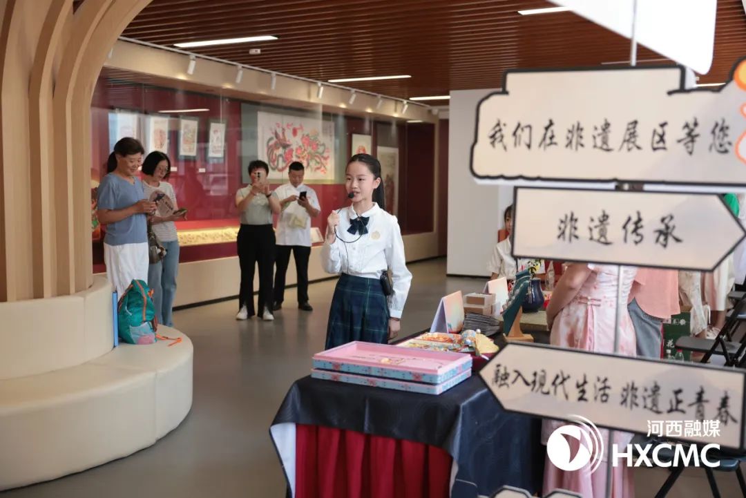 在小小讲解员的引导下,市民们参观了西岸非遗体验馆的各个展区,详细了解了庆音法鼓、桂发祥十八街麻花、剪布肖等河西区国家级、市区级非遗项目,近距离感受非遗作品的精湛工艺和中华优秀传统文化的内涵和价值。活动还邀请到非遗项目传承人现场演示,并设置了技艺体验和VR体验环节,不少市民参与其中,亲身感受津味文化的魅力。
