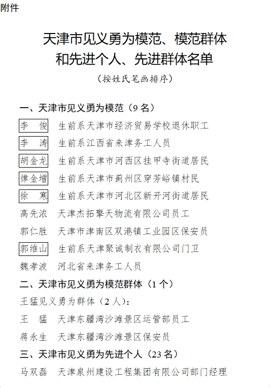 为表彰先进,弘扬见义勇为的崇高精神,根据《天津市见义勇为人员奖励和保护条例》、《天津市人民政府办公厅关于印发天津市见义勇为称号授予办法的通知》(津政办规〔2023〕11号)规定,市人民政府决定,追授李俊等6名同志、授予高先浓等3名同志“天津市见义勇为模范”称号,授予王猛见义勇为群体“天津市见义勇为模范群体”称号,授予马双磊等23名同志“天津市见义勇为先进个人”称号,授予王连海见义勇为群体等7个群体“天津市见义勇为先进群体”称号。