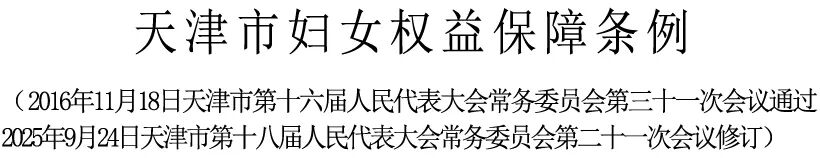 《天津市妇女权益保障条例》已由天津市第十八届人民代表大会常务委员会第二十一次会议于2025年9月24日修订通过,现予公布,自2025年12月1日起施行。