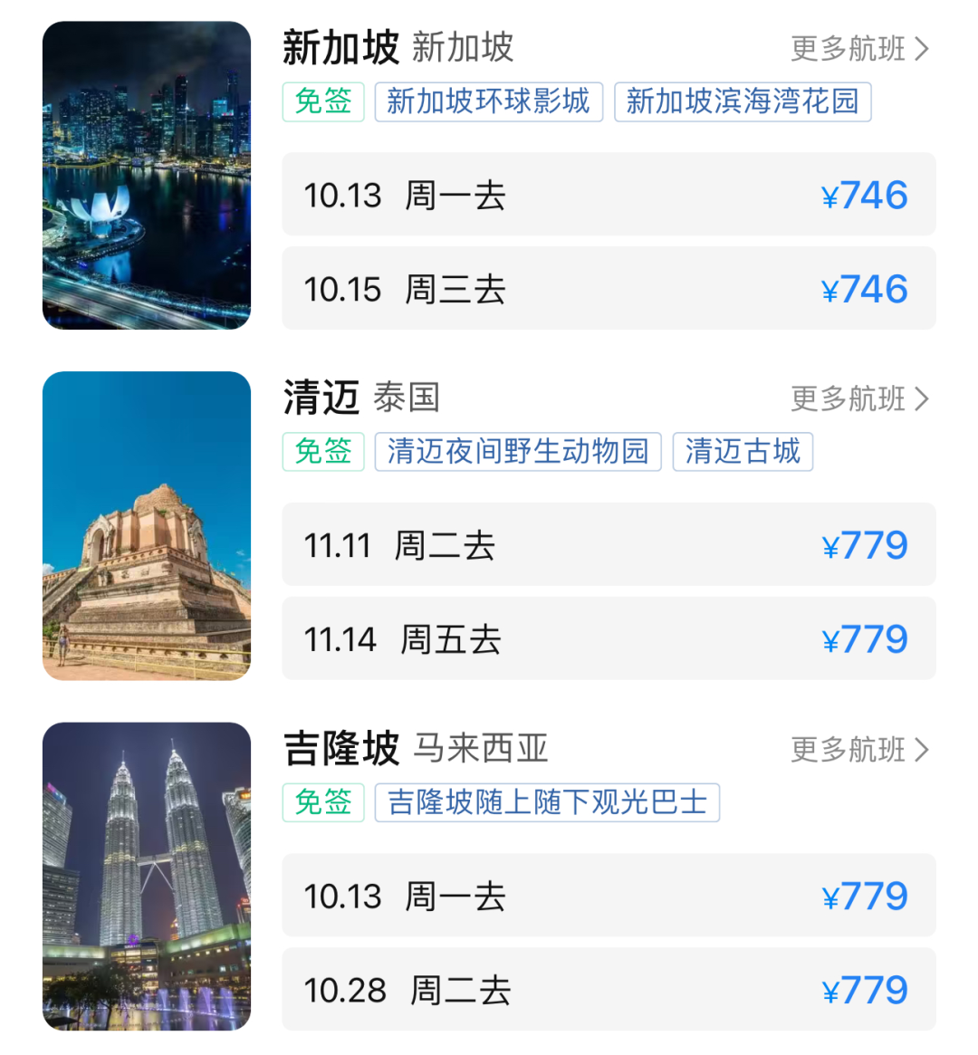 热门旅游地区的最低票价