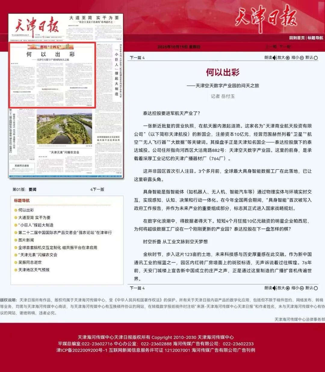 【媒体看河西】《天津日报》头版刊发:何以出彩——天津空天数字产业园的问天之旅