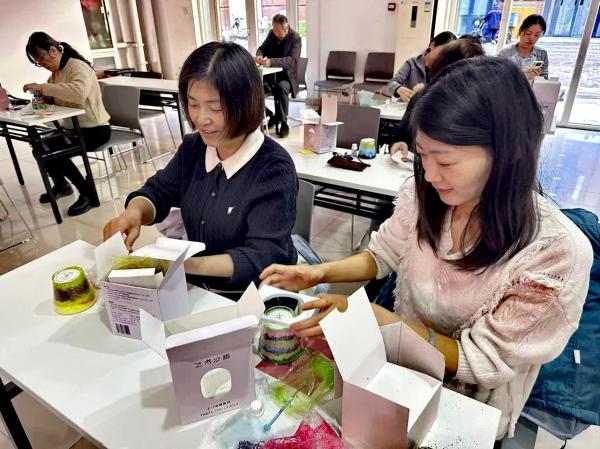 陈塘庄街三诚里社区日前举办了“三诚暖心,多元共融”主题室内香氛沙画香薰蜡烛DIY活动。活动现场,社区工作者首先为大家介绍了香薰蜡烛的制作原理、所需材料以及精油的种类与功效,居民们纷纷化身“生活艺术家”,精心挑选自己喜爱的精油香味,调色、滴入精油。活动现场弥漫着薰衣草的宁静、柑橘的清新、檀香的沉稳,不同的香气交织,仿佛构建了一个个无形的“心灵栖息地”。紧接着,大家用彩色细沙在蜡烛杯壁上进行创作,有的勾勒出简约的几何图案,有的描绘出美丽的花朵,还有的写下了祝福的话语。小小的沙画,成为了每个人独特情感的载体。制作过程中,大家互相交流配色心得、分享精油选择,年轻人帮助年长者操作,原本不甚熟悉的邻居变成了默契的“手工搭档”,邻里关系在协作与分享中悄然升温。