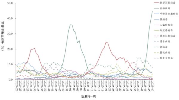 哨点医院门急诊流感样病例呼吸道样本病原体核酸检测阳性率每周变化趋势。《全国急性呼吸道传染病哨点监测情况(2025年第47周)》图