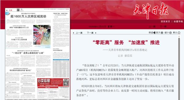 【媒体看河西】《天津日报》:“零距离”服务 “加速度”推进——天津首单机构间REITs项目落地记