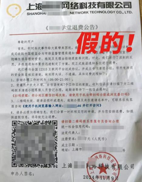 近期,有不法分子以“全国12315平台”名义,通过短信图片或邮寄等方式发送虚假退费公告,谎称联合全国12315平台办理“退费业务”,并以“办理退费事宜”为名,诱导消费者扫描虚假退费二维码,致使消费者利益受损。