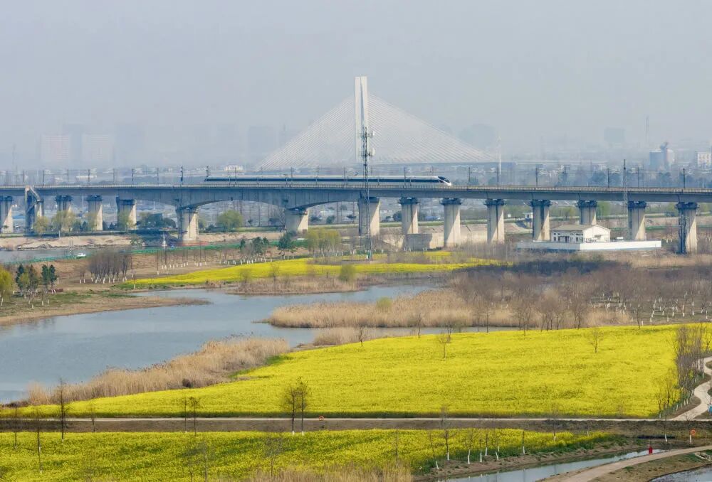 2026年3月11日,一列高铁列车穿行在安徽省合肥市肥东县十八联圩生态湿地(无人机照片)。新华社记者 杜宇 摄