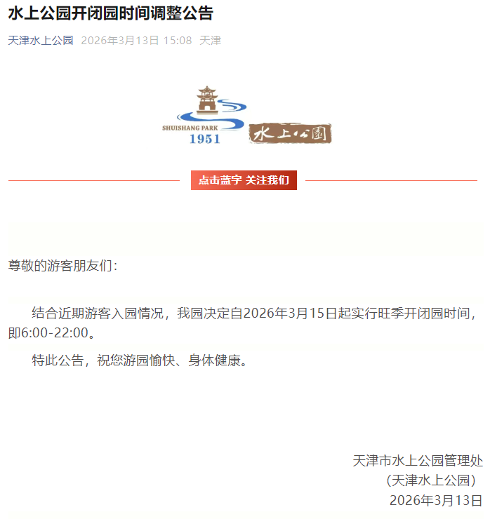 3月13日,微信公众号“天津水上公园”发布了一则公告,全文如下: