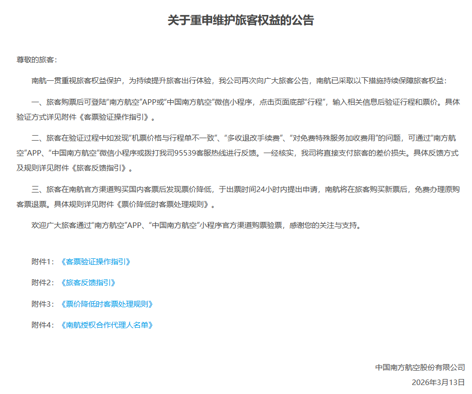 3月13日晚上,国航、东航、南航等国内三大航均发布维护旅客权益公告称,旅客购买机票后可通过航司官方渠道查询票价、税费、行程等信息,若发现第三方销售商存在加价销售、篡改行程、多收退改手续费等行为,可直接向航司反馈,一经查实,航司将为旅客退还差价损失,并对相关销售商进行追责。旅客购票后若降价了,可免费退票后重新购票。