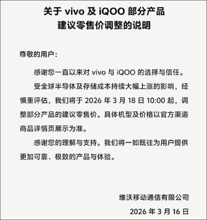 3月16日上午,vivo在官网发布零售价格调整说明。vivo表示,“受全球半导体及存储成本持续大幅上涨影响,经慎重评估,将于3月18日10:00起,调整部分产品建议零售价。”