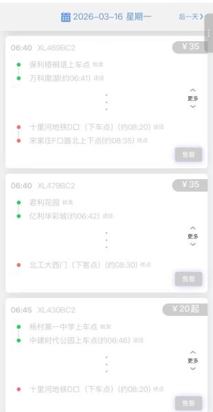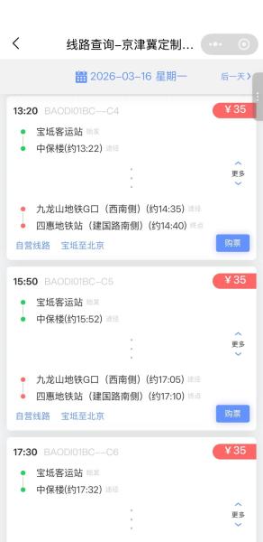 “京津冀定制快巴”小程序天津-北京线路部分页面截图